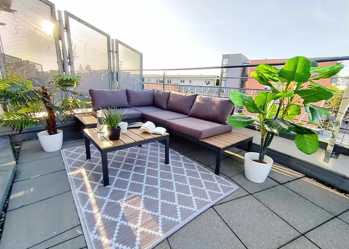 Ulmer Penthouse Fur 7, Arbeitsplatz, Xxl-Dachterrasse, Grill, Wii ferielejlighed ligger 2 km fra Ulm, hvor der tilbydes forskellige faciliteter såsom terrasse-restauranten og en golfbane. Gæsterne kan også besøge Löwenbrunnen inden for 10 minutters kørsel.